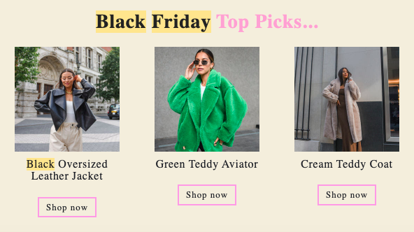 We love the way this brand has laid out their marketing email. This is a great strategy because Black Friday can often be an overwhelming time to shop for customers. They might want to take advantage of the great deals, but feel bombarded with promotions from different shops and not know where to start with all the products on sale.