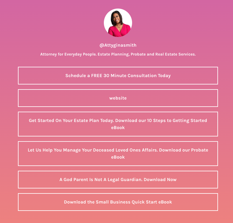 For example, attorney Gina Smith offers free guides to “10 steps to getting started with your estate planning,” a probate ebook and a “Small Business Quick Start” ebook in her Instagram’s link in bio. These provide the incentives needed for Instagram visitors to part with their email address.