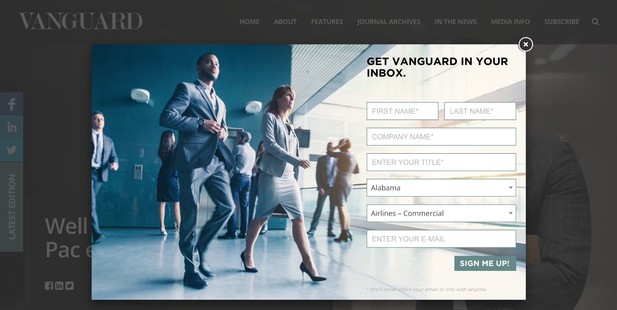 That’s the tactic used by legal trade publication Vanguard, who use a pop-up form on their website to capture visitors’ contact information as they’re browsing their journal archives or reading their blog.