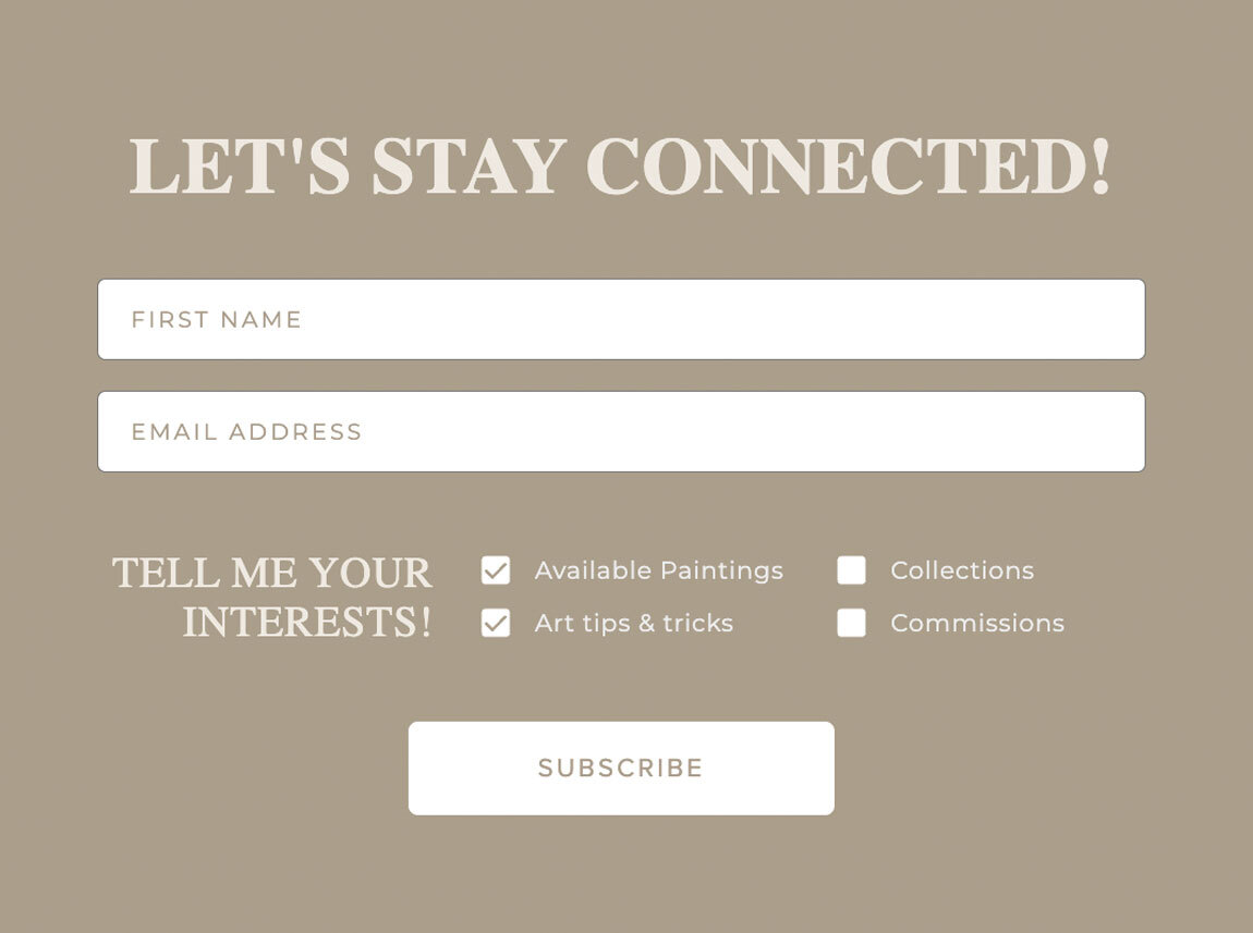 K Zylstra Studio keeps her sign-up form simple, offering subscribers the option to set preferences.