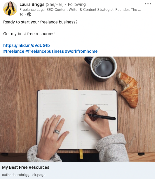 For example, freelance coach Laura Briggs offers free resources for starting a freelance business in this LinkedIn post. She gathers a first name and email address every time someone signs up for this freebie.