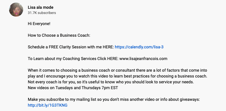 For example, business coach Lisa Jean-Francois uses YouTube’s video description to grow her mailing list. She provides a direct link where viewers can subscribe to learn about new videos and giveaways.