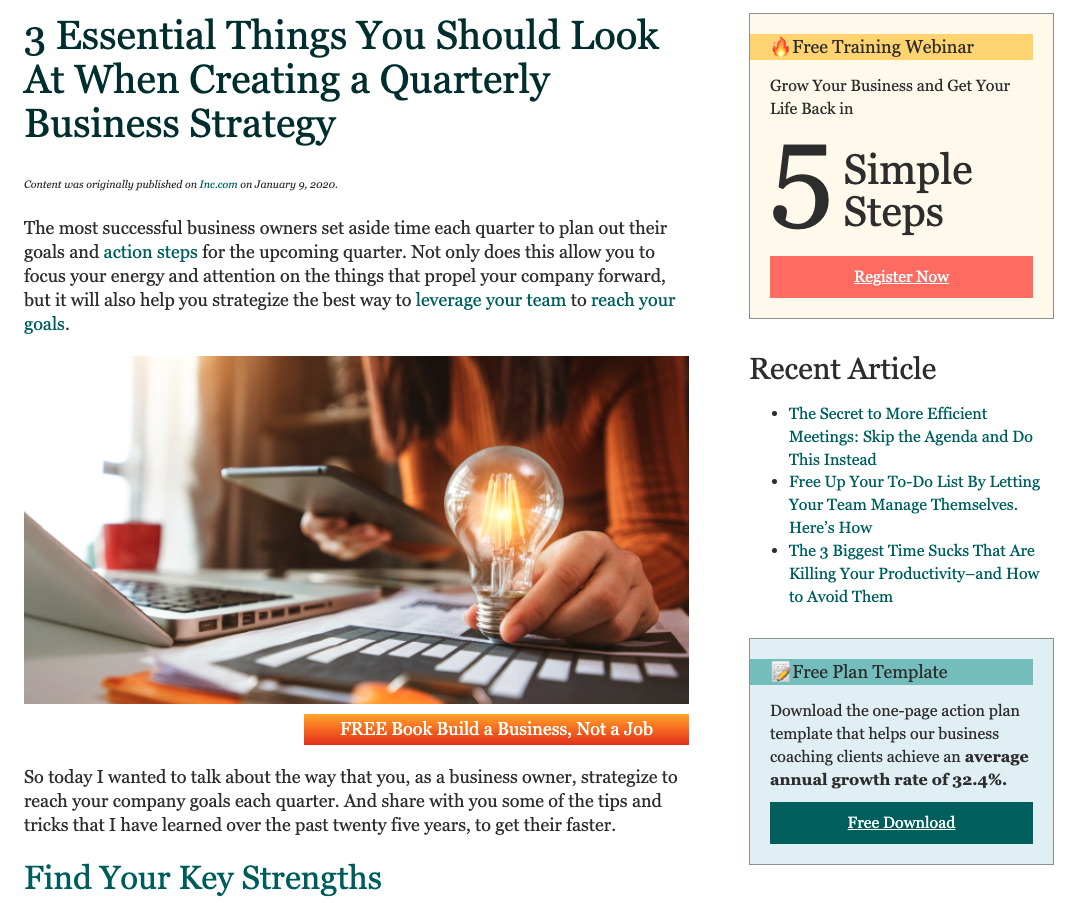 For example, in this blog, Maui Mastermind, a business coach offers the reader a free plan template and a free training webinar to grow their business. When someone downloads the template or signs up for the webinar, the business adds another email to its list.