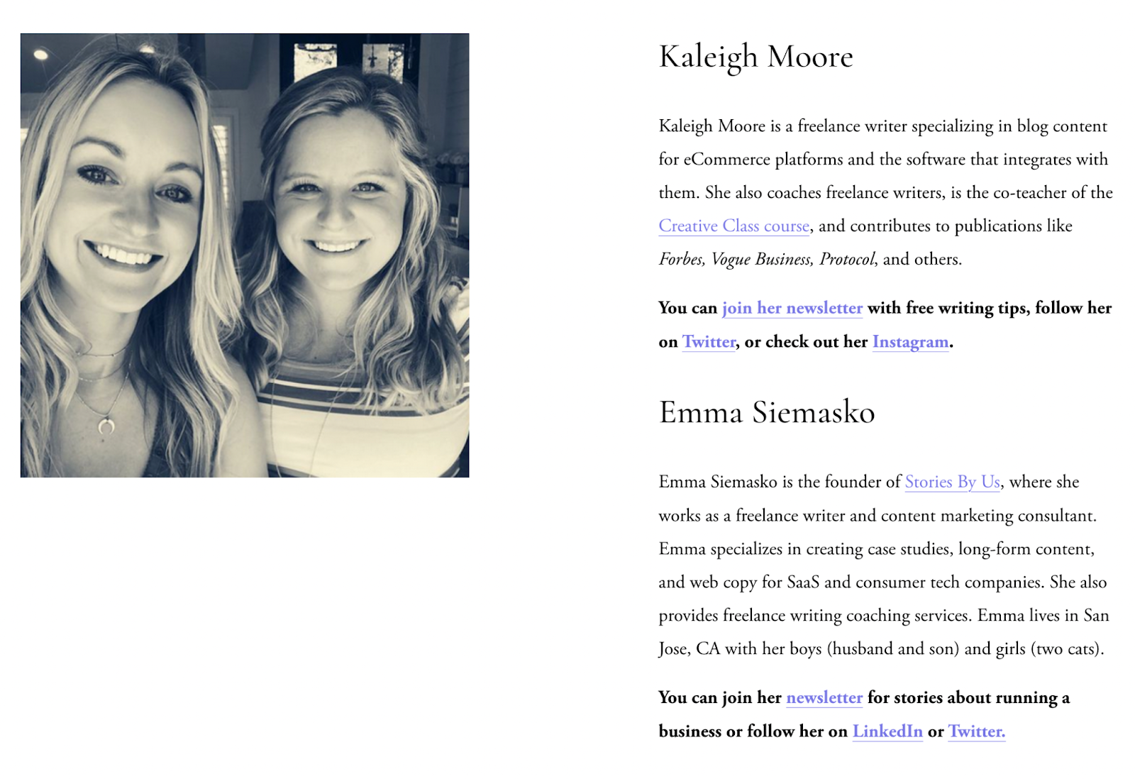 For example, freelance writing coaches Kaleigh Moore and Emma Siemasko created a website to go along with their podcast, “Freelance Writing Coach.” They collect email addresses when listeners sign up for their newsletters and new episode notifications.