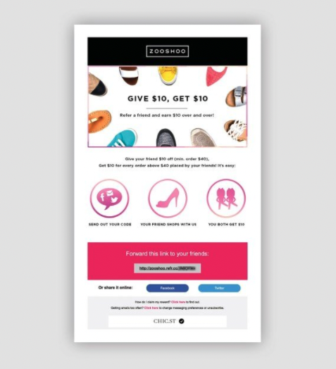 In this example, ZooShoo tells subscribers to “forward this link to your friends” so both groups can get $10 off a purchase. The business motivates the friends to become subscribers by offering discounts for referrals.