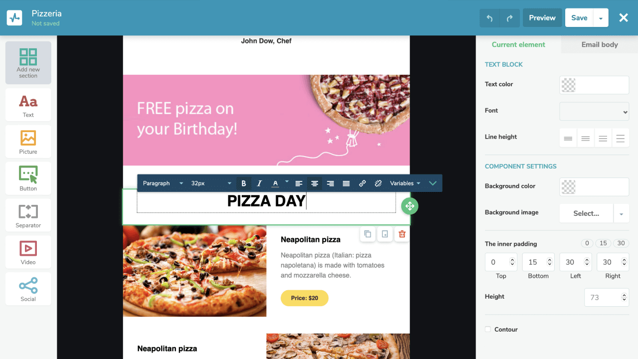 - Drag-and-drop email editor: Insert all kinds of elements without any coding know-how.