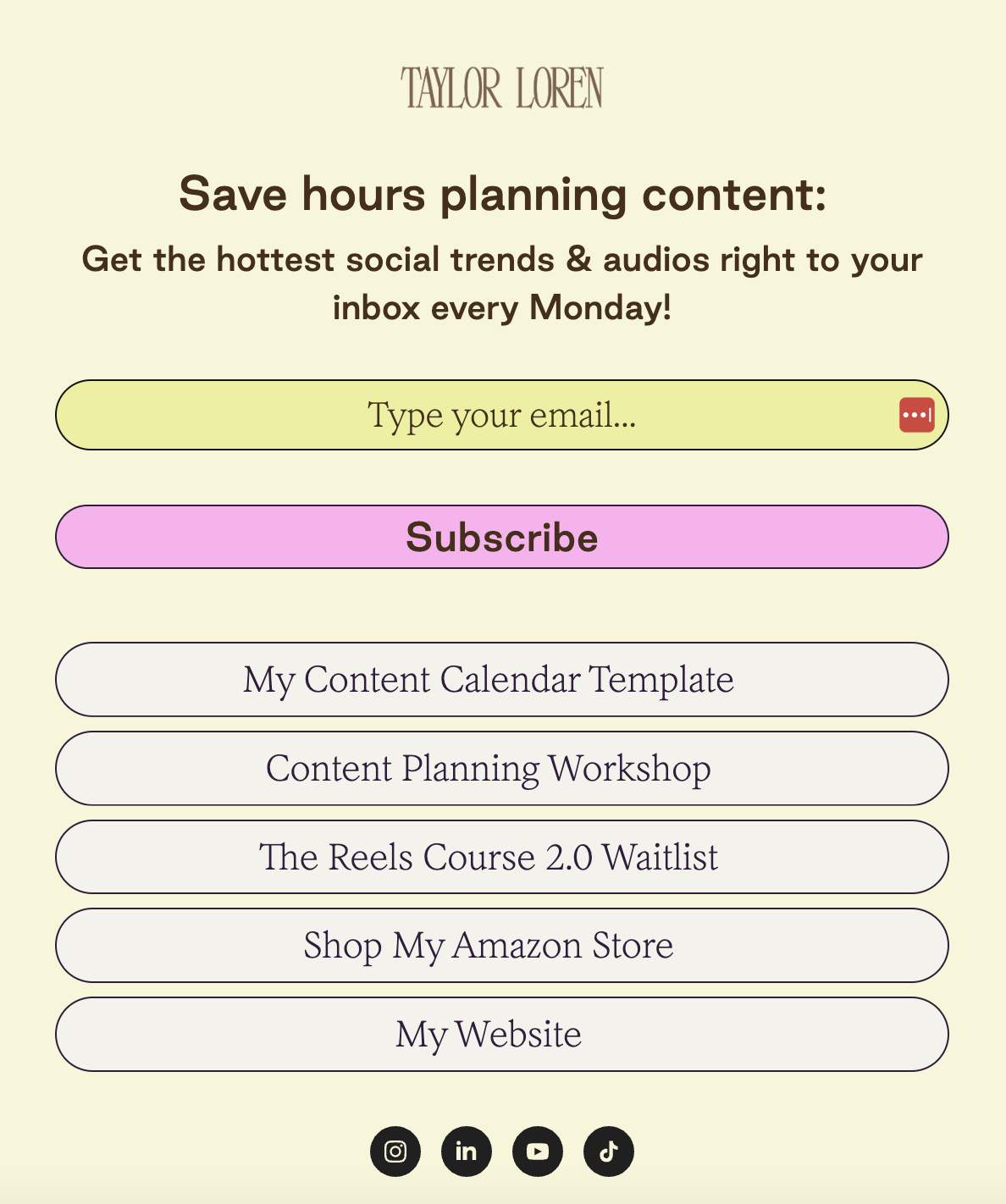 Flodesk member and creator Taylor Loren made the switch to a Flodesk Link in bio this year to promote her personal brand and waitlist signups for her online course. She loves using it to grow her email list, adding, “When you click on my link in bio and go to the links on my website, it all looks so seamless. And I love the ability to get newsletter subscribers right from the link in my bio, too!”