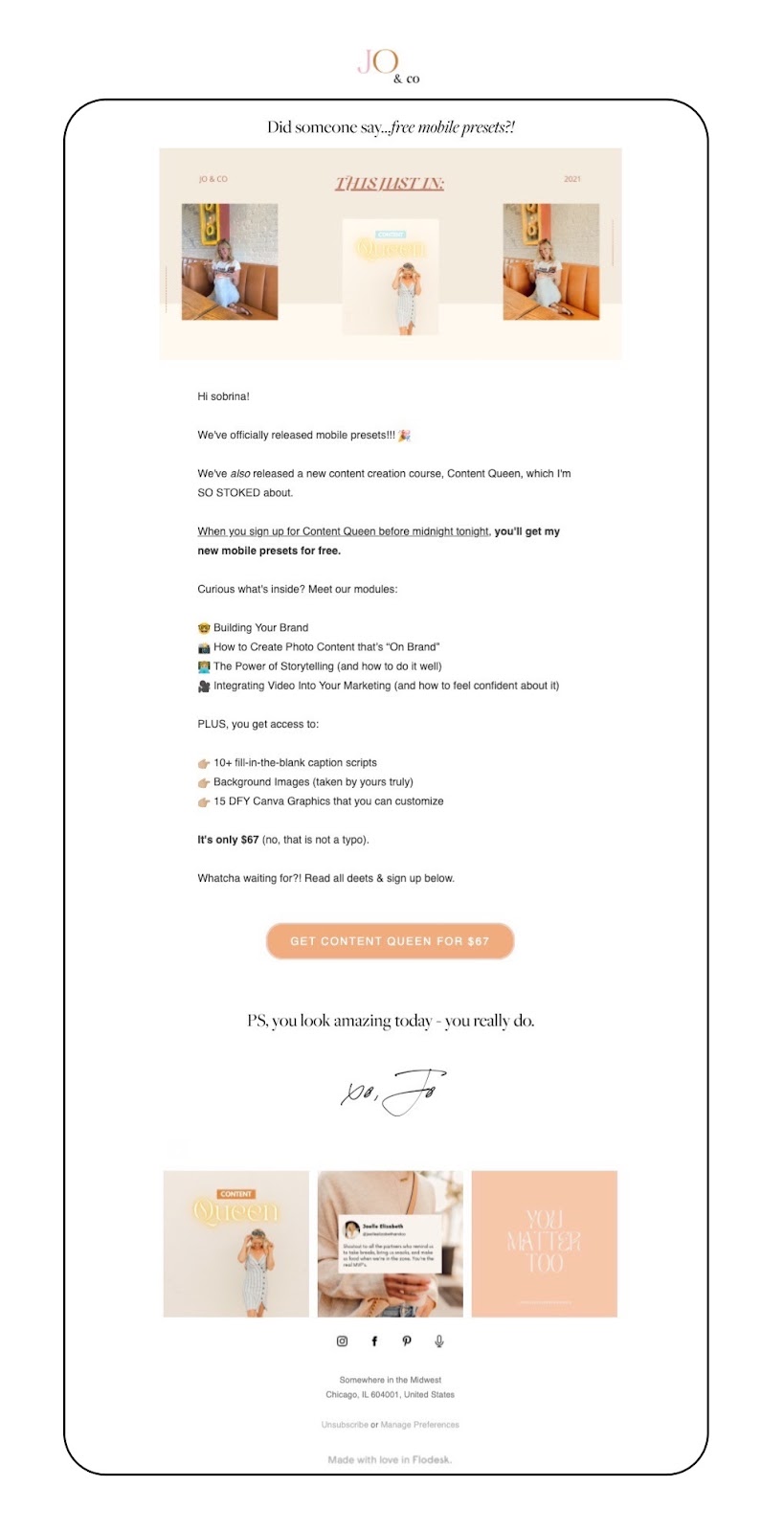 Flodesk member Joelle Elizabeth, an online business owner, shares her paid course with her newsletter readers. She also fosters connection by offering a freebie: mobile presets to those who purchase before a certain time.