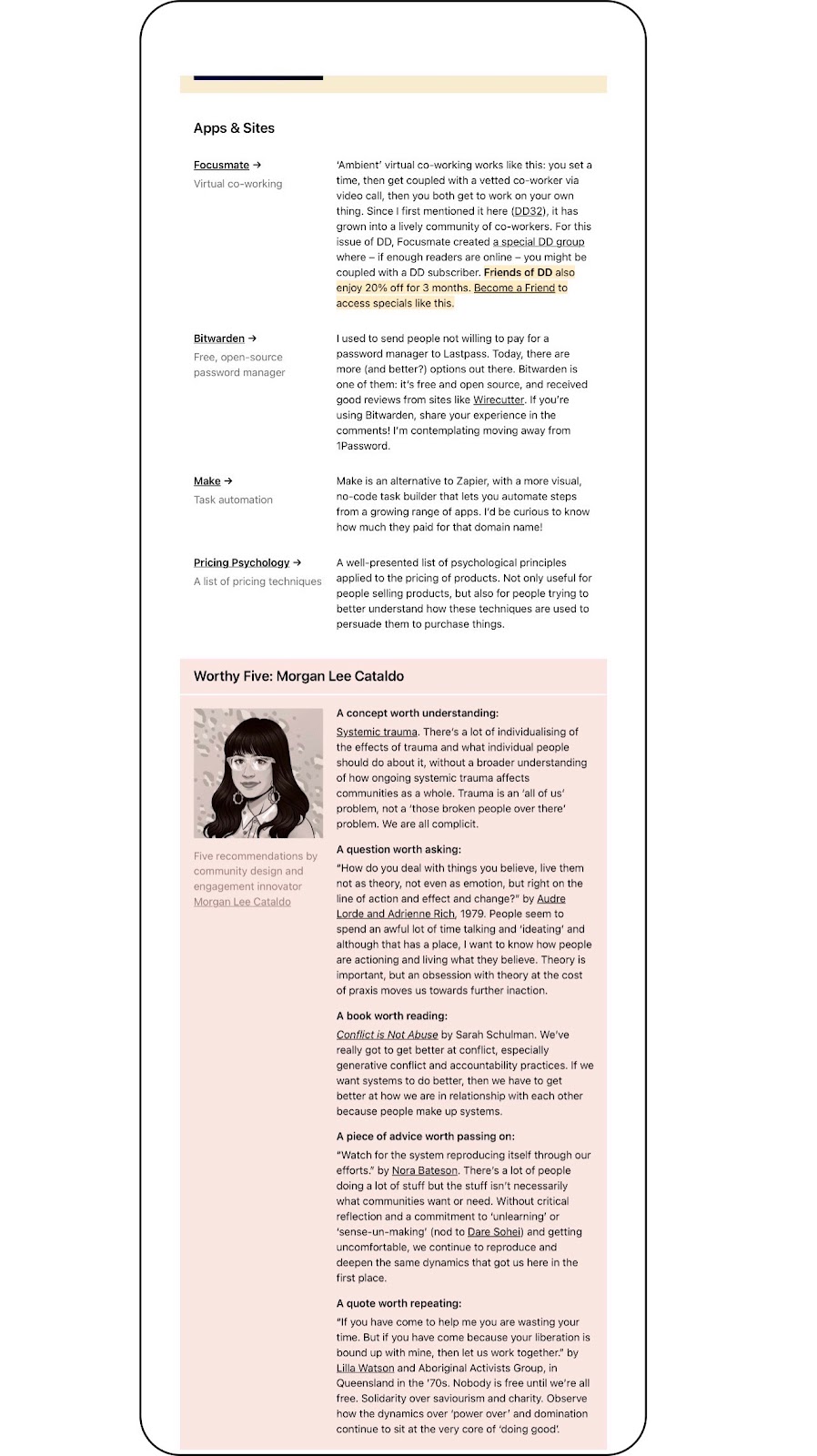 This weekly newsletter by Kai Brach is an example of high-quality content. It provides actionable advice, helpful article recommendations and tools to stay inspired and productive. It also shares discoveries at the intersection of design, technology, sustainability and culture.