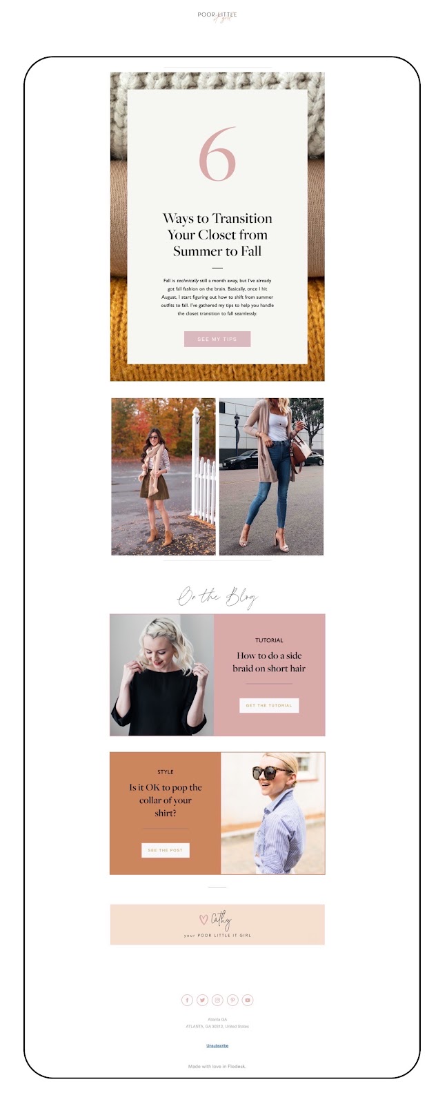 Case in point: Flodesk member Cathy, a lifestyle blogger at Poor Little It Girl, provides summer fashion advice to her subscribers. She builds on this trust to give a product recommendation using her affiliate link. Cathy is a good example of someone using a monetization method that is suitable for herself and her audience.
