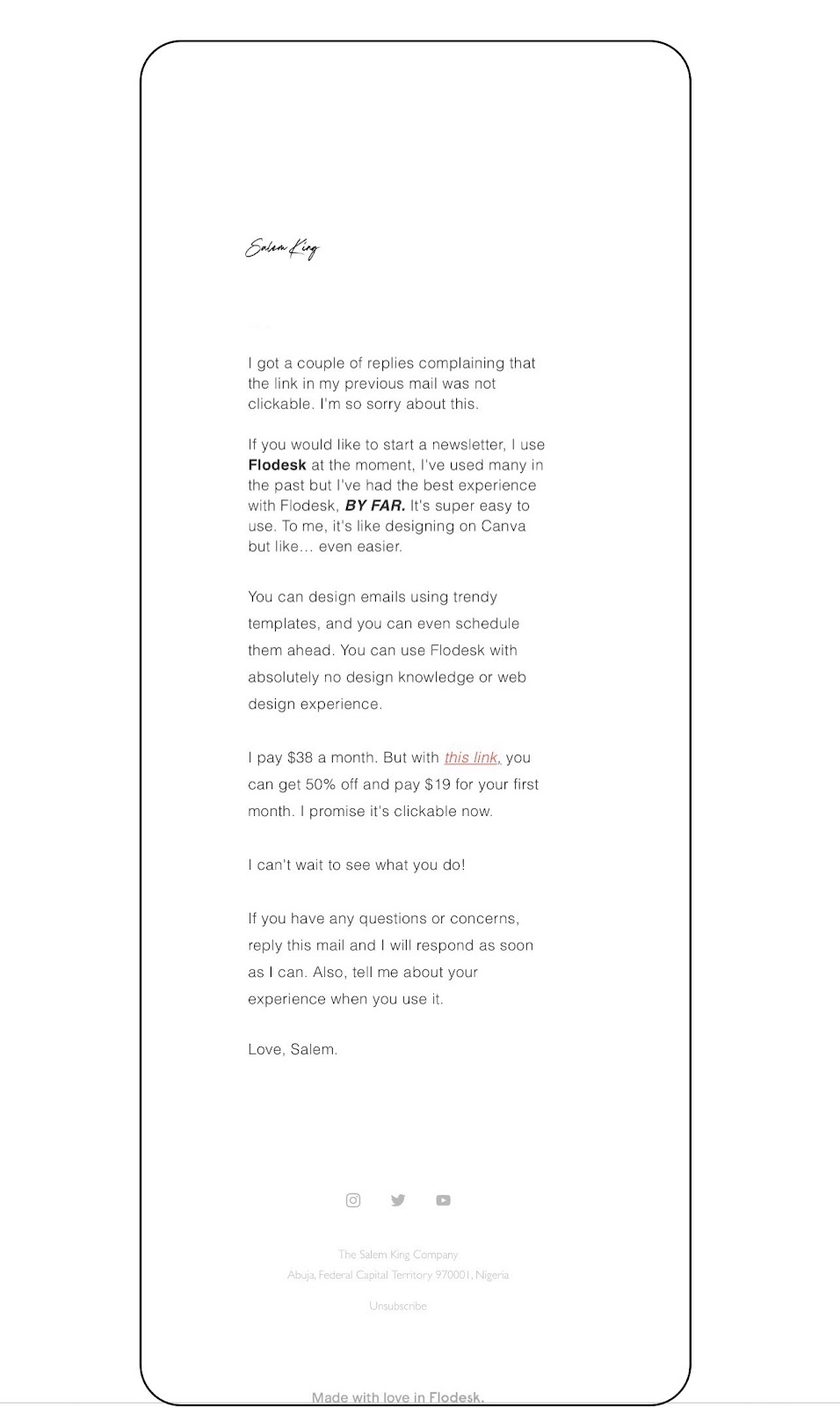 In the image below, Flodesk member Salem King, a digital marketing coach, shares an affiliate product link to an email marketing platform in his newsletter. Not only does this provide a source of income for Salem, but it also shares a product that resonates with his subscribers, who are digital creators themselves.