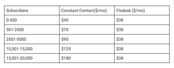 For example, look at the differences in rates between Constant Contact and Flodesk as your list grows. You can see how the service provider you choose can have a big impact on your monthly expenses.
