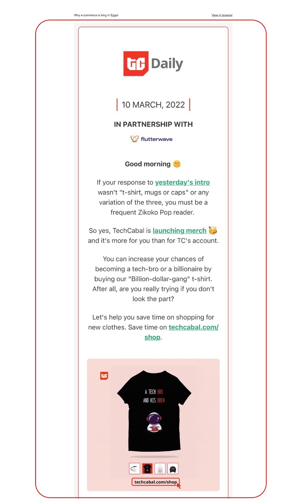 A good example is TechCabal, a daily newsletter that shares insights from the African tech space. They have a long-term relationship with Flutterwave, who has a reserved space in TechCabal’s newsletter.