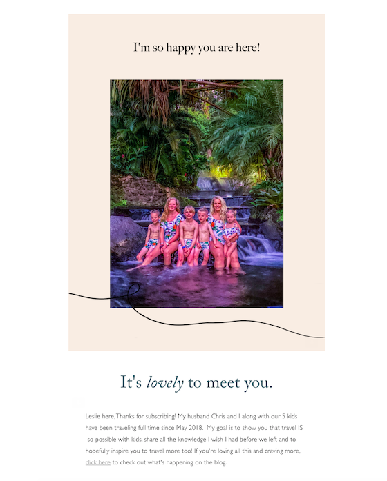 7 Wayfinders is a family of seven that has dedicated themselves to traveling the world and is passionate about showing their community how to do the same. They do a good job of introducing themselves in their welcome email above, and we love that they’ve provided a sweet family photo as well.