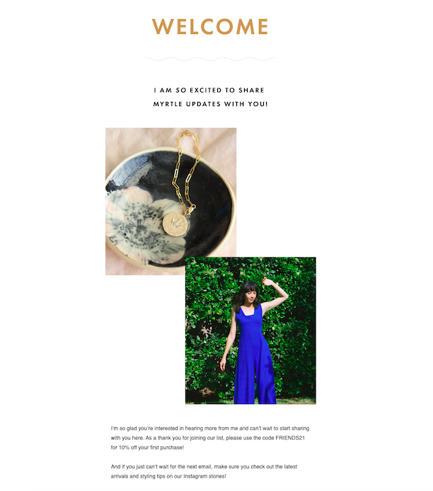 In the welcome email example above, Myrtle does a great job in letting their subscribers know what to expect for their email list. Alongside communicating that they’re going to be sharing their latest updates, arrivals, and styling tips, they also provide new subscribers with a discount code.
