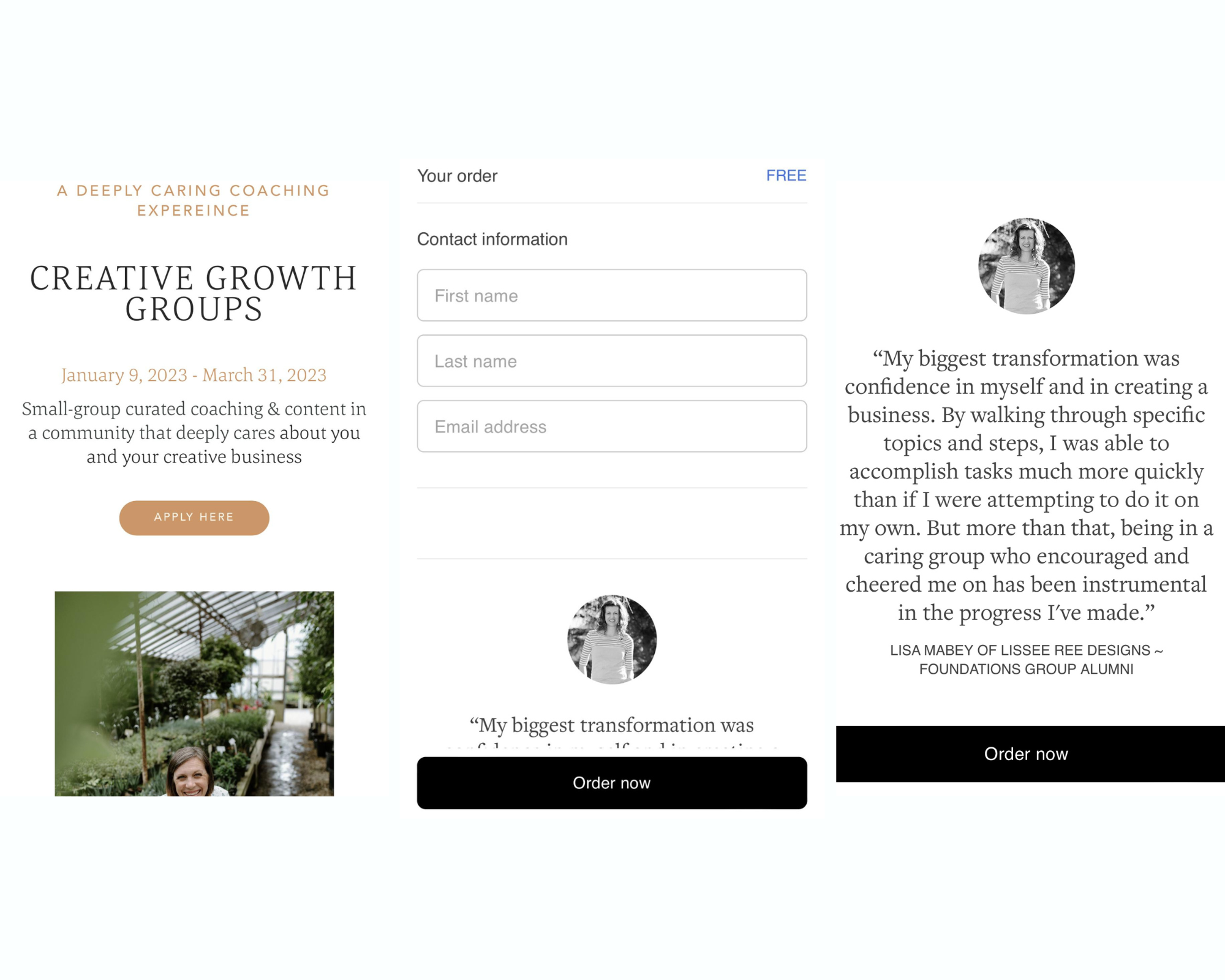 Creative Growth Groups is a small-group coaching initiative hosted by a woman named Colleen Annalea. Colleen uses Flodesk Checkout to gather applications for new members to join her group of mentees. Each member helps encourage the others with connection and accountability. Colleen’s ultimate goal is to help each member of her group elevate their business and marketing strategies.