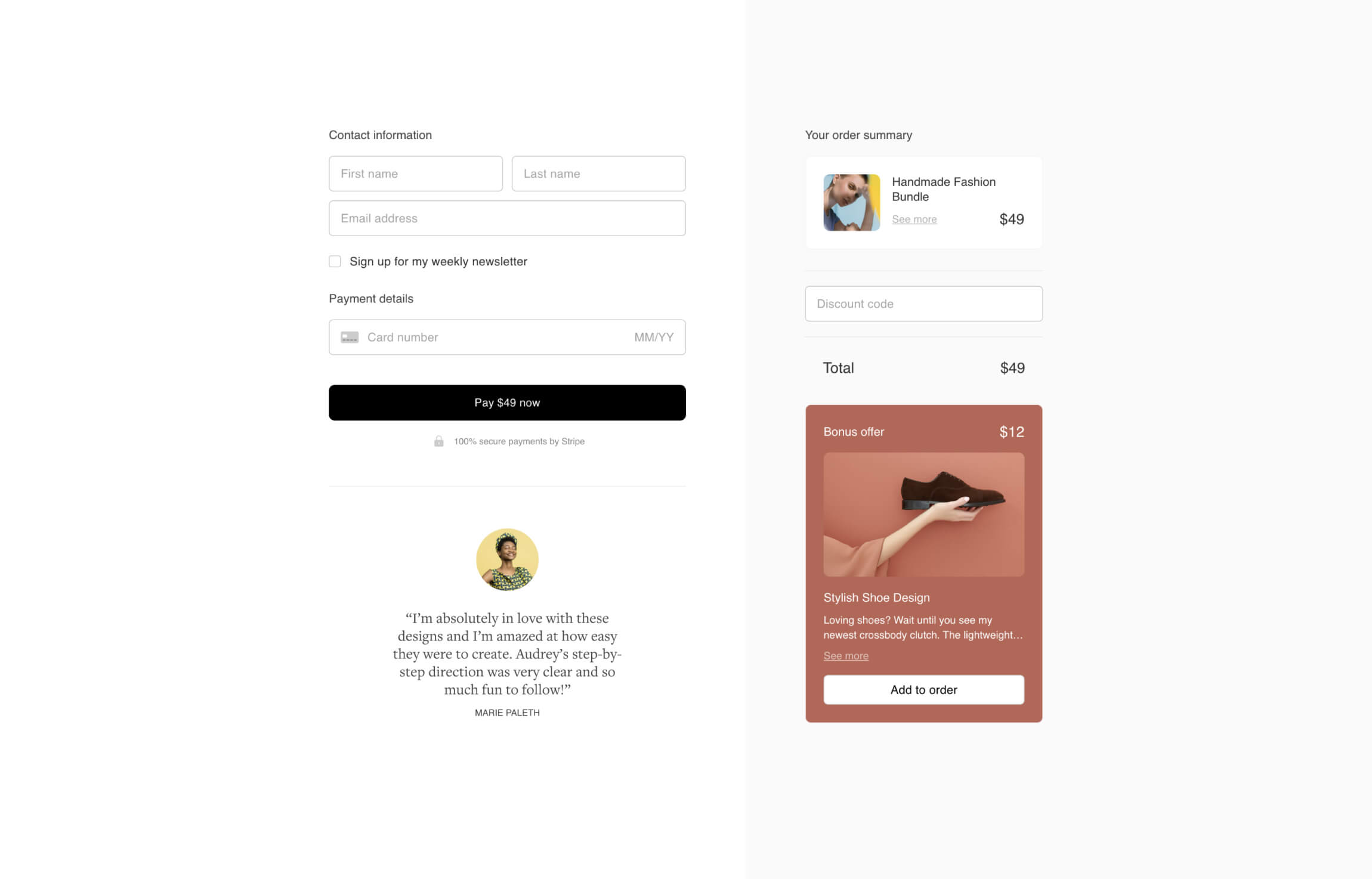 Make it easy for visitors to buy from you with a conversion-optimized payment page. Offer an upsell to generate even more revenue or a discount to drive urgency.