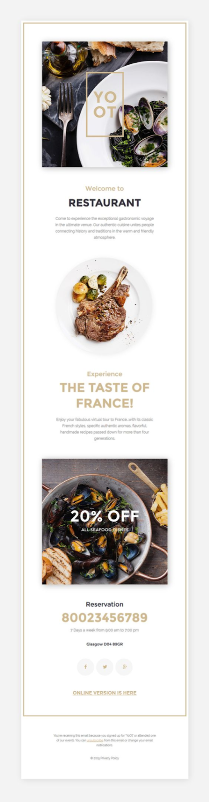 Offering a 20% discount on its seafood dishes is how Yoot restaurant makes a splash with its subscribers. The promotion amount is large and clear—using a white font really helps it stand out against the background color. Also, the beautiful images and clever use of white space show off the best of their delicious dishes on offer.
