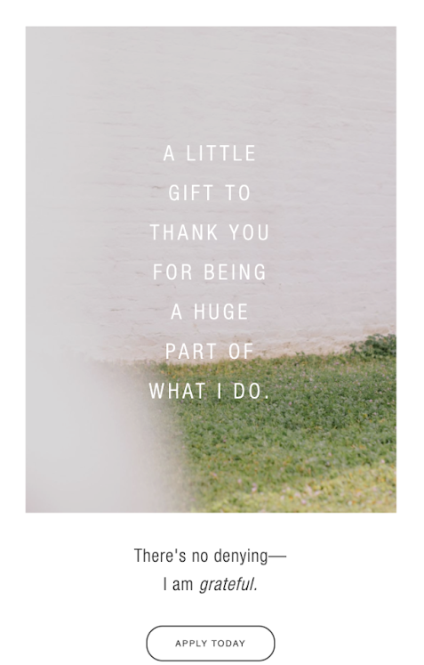 Business therapist Ashley Cook Adair does this perfectly with this gratitude email to her subscribers. It shares how grateful she is for their support as she’s built up her coaching business, and she offers a personal invite for loyal subscribers to join her exclusive new course.