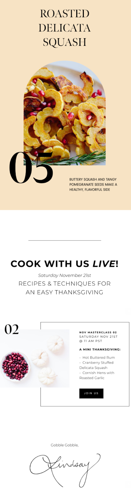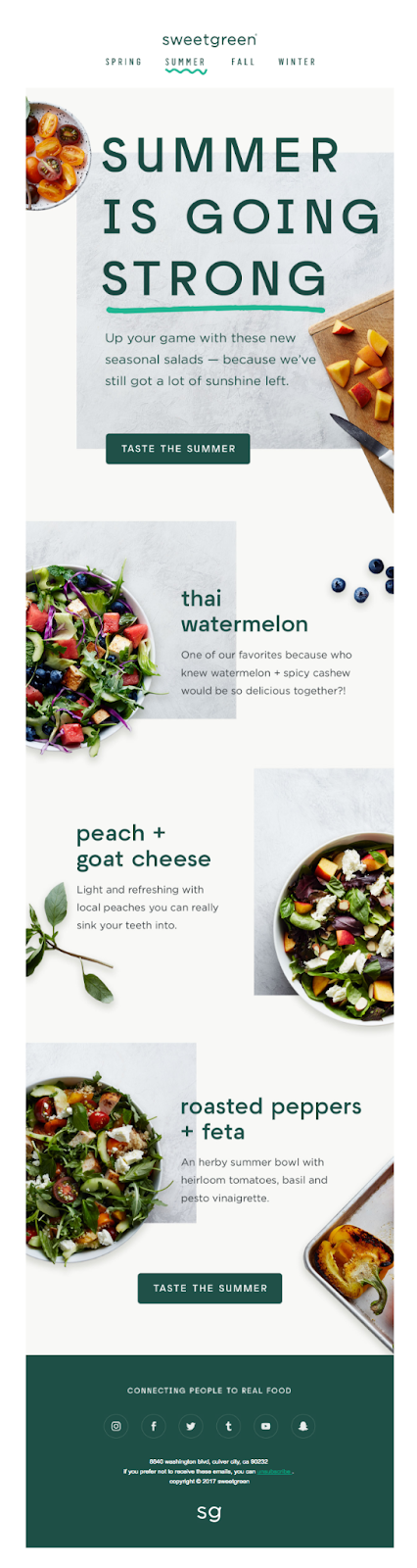 Plus, gorgeously shot pictures of food are pretty much guaranteed to make readers hungry, which—if they can’t wait—might just result in them picking up the phone and making a reservation. Take inspiration from plant-based food blog Nutriciously who put together this beautifully-designed newsletter: