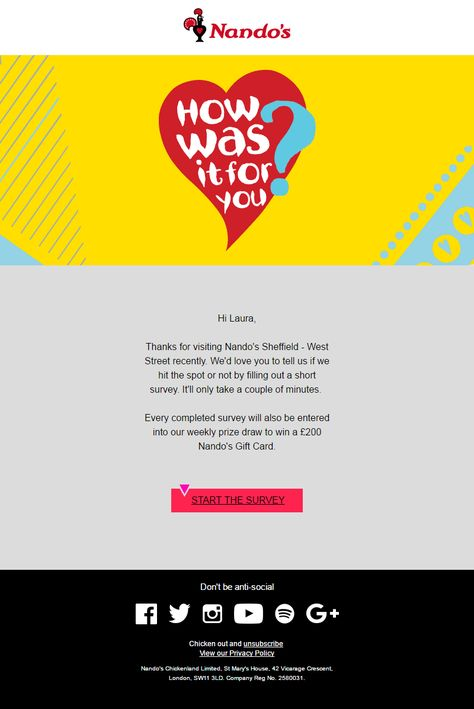 Nando’s sends this exact type of email after customers have visited one of their locations. Their review email design is clever since, by tying it to a visit, it shows they care about their customers’ personal opinions. They can also use any information gathered to make positive changes specific to that location. They incentivize a response by offering entry to a weekly prize draw and downplay the level of effort required by sharing that the survey will only take a few minutes.