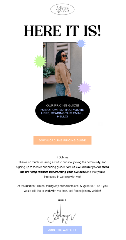 In this thank you email from Alyssa Nguyen Design Studio, new subscribers receive a link to download the brand’s pricing guide. Here’s why this email works: