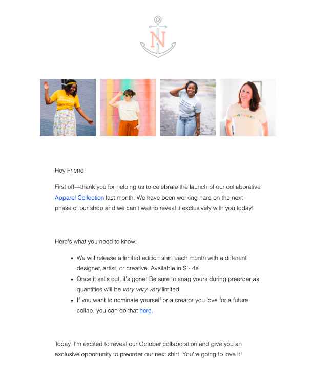 In this thank you email from entrepreneur, community builder and author Natalie Franke, she thanks customers for helping to launch a new product and offers an exclusive preview of what’s coming next. Here’s why this email works: