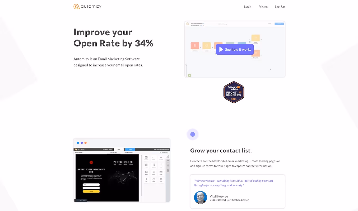 Automizy is an email marketing software that helps users increase their email open rates. It offers tools for creating landing pages and sign-up forms to capture contact information, building email automations, and creating emails using a drag-and-drop editor. The software includes features for testing subject lines, performing A/B tests on automated emails, and analyzing email campaign performance. It also provides various integrations with other tools and platforms.