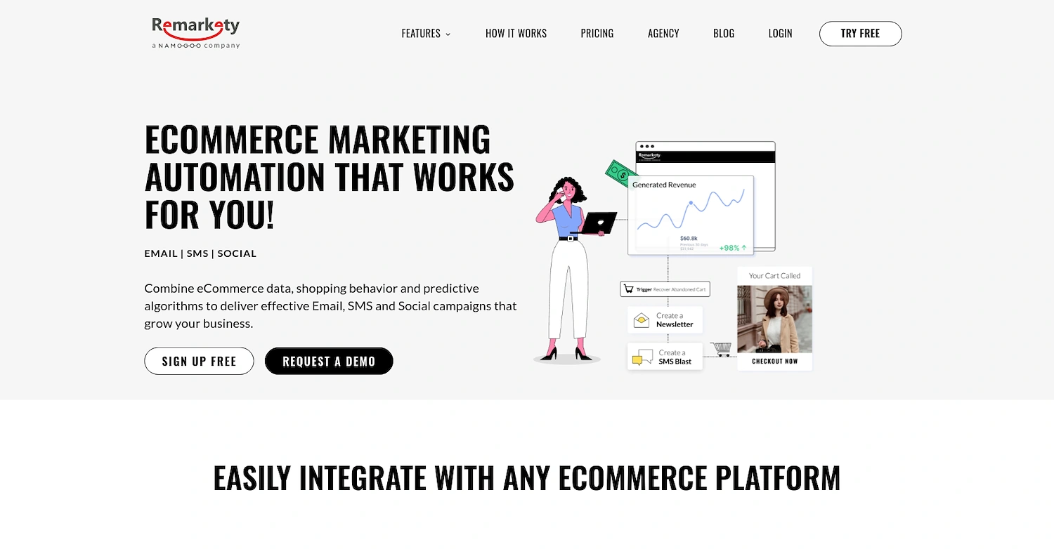Remarkety offers eCommerce marketing automation services, including email marketing automation, SMS marketing, and social media campaigns. The platform uses eCommerce data, shopping behavior, and predictive algorithms to create personalized and automated marketing campaigns, aiming to maximize revenue and conversions.