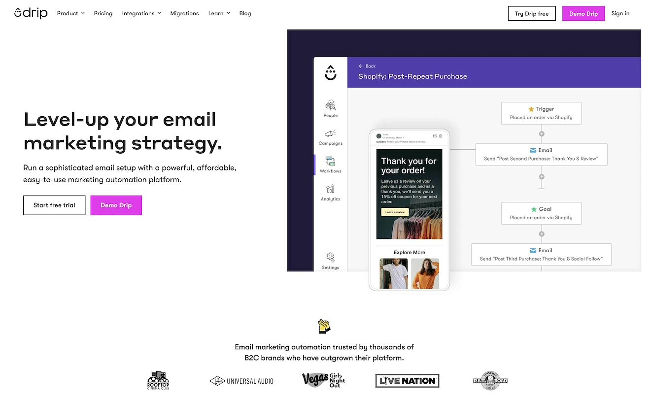Drip is a marketing automation platform that helps businesses automate their email marketing strategies. It offers tools for designing and sending emails, segmenting audiences, creating embedded forms, and running multi-channel marketing campaigns. Drip also provides insights and data to help businesses understand their customers better.