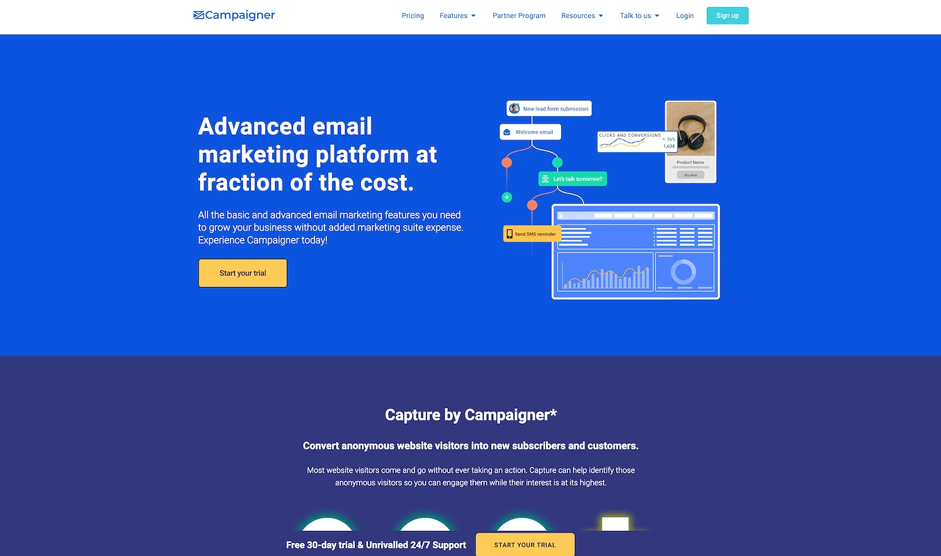 Campaigner provides an email marketing platform with features for campaign automation, including AI-driven insights, email and SMS workflows, and list management tools. The platform also offers a drag-and-drop email builder and personalized support to help users create and manage their marketing campaigns efficiently.