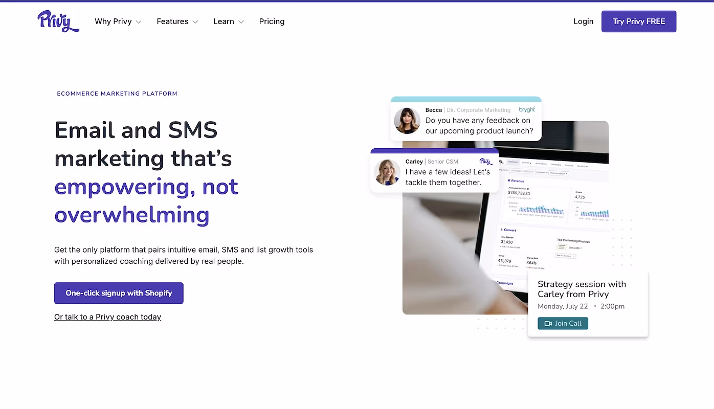 Privy is a platform that helps businesses increase sales through email and SMS marketing. It offers tools for list growth, campaign management, audience insights, and revenue automation, supporting the entire customer journey from initial visit to loyal customer.